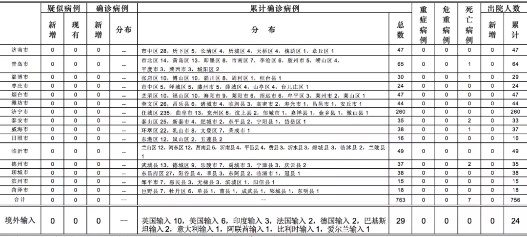 山东无本地住院疑似病例、确诊病例。累计报告确诊病例763例,死亡7例,治愈出院756例。