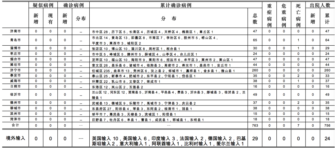 2020年6月3日0时至24时:山东无本地住院疑似病例、确诊病例。累计报告确诊病例763例,死亡7例,治愈出院756例。山东无新增境外输入疑似病例、确诊病例。累计报告境外输入确诊病例29例。无新增治愈出院病例,累计治愈出院24例。山东无新增无症状感染者。正在隔离观察治疗的无症状感染者2例(境外输入)。目前共追踪到密切接触者21872人,尚有195人正在接受医学观察。详见下表(单位:例):