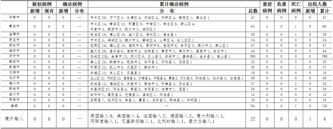 山东本地无新增疑似病例、确诊病例。累计报告确诊病例761例,死亡7例,治愈出院752例。