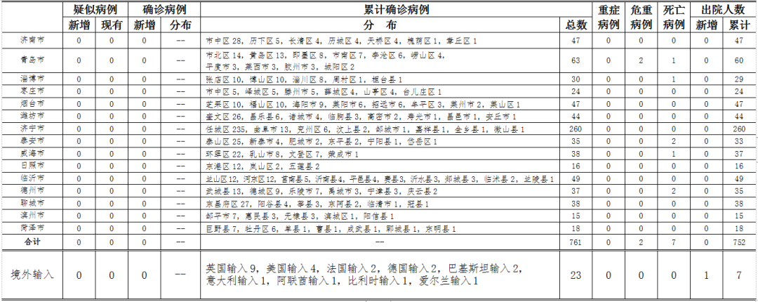 山东本地无新增疑似病例、确诊病例。累计报告确诊病例761例,死亡7例,治愈出院752例。