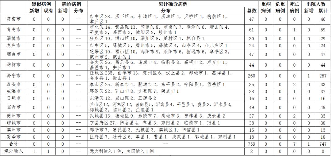 2020年3月18日12-24时,山东省本地无新增确诊病例,无新增疑似病例,累计报告确诊病例759例。无重症病例、危重症病例;累计死亡病例7例;新增治愈出院病例1例,累计治愈出院747例。