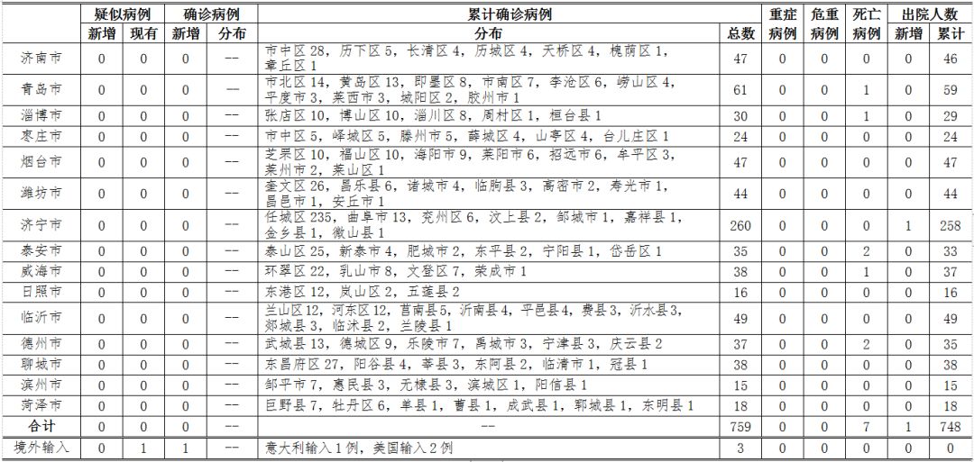 2020年3月19日12-24时,山东省本地无新增确诊病例,无新增疑似病例,累计报告确诊病例759例。无重症病例、危重症病例;累计死亡病例7例;新增治愈出院病例1例,累计治愈出院748例。