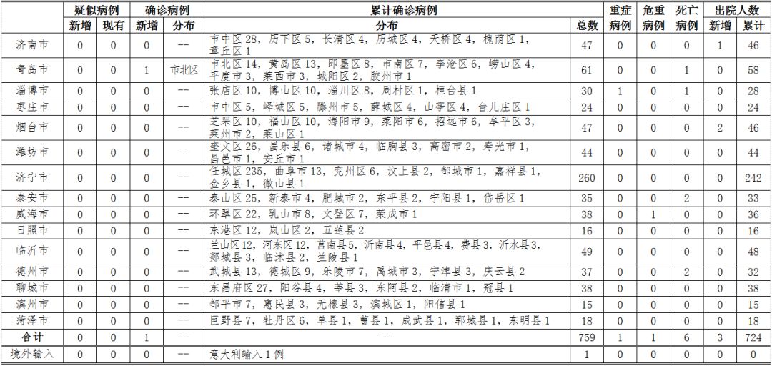 2020年3月11日0-12时,山东省本地新增确诊病例1例,无新增疑似病例,累计报告确诊病例759例(其中,重症病例1例,危重症病例1例,累计死亡病例6例);新增治愈出院3例,累计治愈出院724例。目前共追踪到密切接触者17090人,尚有129人正在接受医学观察。