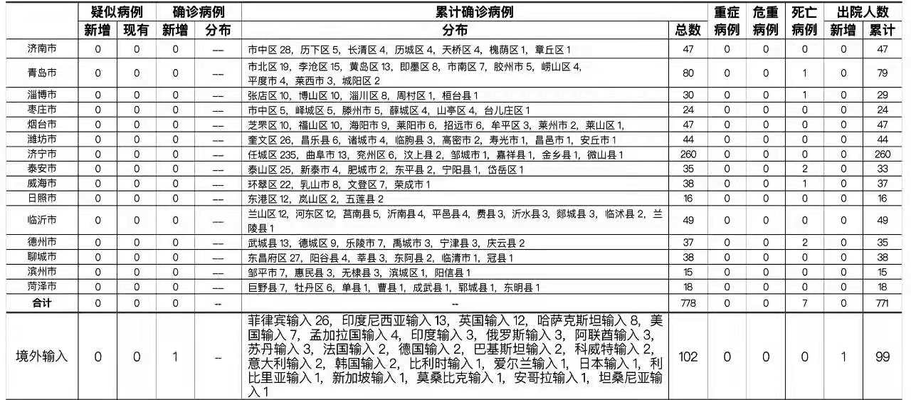 2021年5月11日0时至24时:山东无新增本地疑似病例、确诊病例。累计报告确诊病例778例,死亡7例,治愈出院771例。山东无新增境外输入疑似病例,青岛市报告韩国输入确诊病例1例。累计报告境外输入确诊病例102例,新增治愈出院病例1例,累计治愈出院99例。正在住院治疗的确诊病例3例。山东无新增无症状感染者。正在隔离观察治疗的无症状感染者7例(境外输入7例)。2020年以来全省共追踪到密切接触者30015人,目前尚有78人正在接受医学隔离观察。详见下表(单位:例):