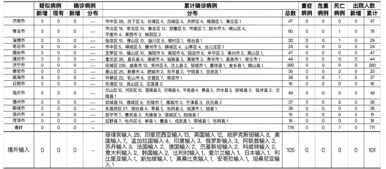 2021年5月20日0时至24时:山东无新增本地疑似病例、确诊病例。累计报告确诊病例778例,死亡7例,治愈出院771例。山东无新增境外输入疑似病例、确诊病例。累计报告境外输入确诊病例105例,治愈出院101例。正在住院治疗的确诊病例4例。山东无新增无症状感染者。正在隔离观察治疗的无症状感染者4例(境外输入4例)。2020年以来全省共追踪到密切接触者30110人,目前尚有109人正在接受医学隔离观察。详见下表(单位:例):