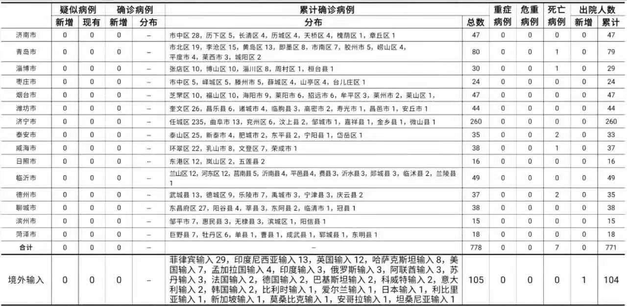 2021年6月5日0时至24时:山东无新增本地疑似病例、确诊病例。累计报告确诊病例778例,死亡7例,治愈出院771例。山东无新增境外输入疑似病例、确诊病例。累计报告境外输入确诊病例105例,新增治愈出院病例1例,累计治愈出院104例。正在住院治疗的确诊病例1例。山东无新增无症状感染者。正在隔离观察治疗的无症状感染者8例(境外输入8例)。2020年以来全省共追踪到密切接触者30175人,目前尚有40人正在接受医学隔离观察。详见下表(单位:例):