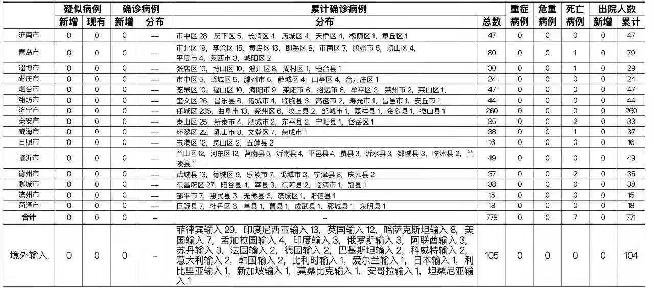 2021年6月15日0时至24时:山东无新增本地疑似病例、确诊病例。累计报告确诊病例778例,死亡7例,治愈出院771例。山东无新增境外输入疑似病例、确诊病例。累计报告境外输入确诊病例105例,累计治愈出院104例。正在住院治疗的确诊病例1例。山东无新增无症状感染者。正在隔离观察治疗的无症状感染者6例(境外输入6例)。2020年以来全省共追踪到密切接触者30185人,目前尚有30人正在接受医学隔离观察。详见下表(单位:例):