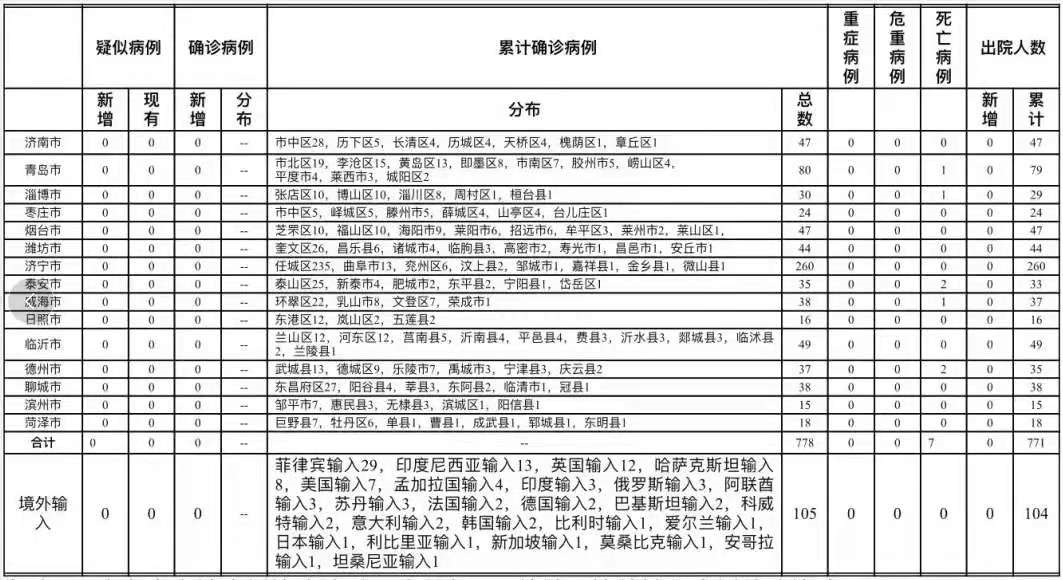 山东无新增本地疑似病例、确诊病例。累计报告确诊病例778例,死亡7例,治愈出院771例。
