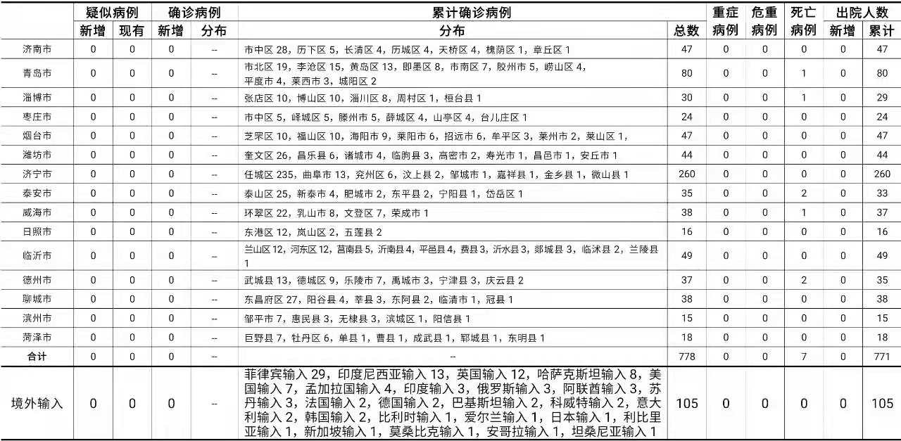 2021年7月3日0时至24时:山东无新增本地疑似病例、确诊病例。累计报告确诊病例778例,死亡7例,治愈出院771例。山东无新增境外输入疑似病例、确诊病例。累计报告境外输入确诊病例105例,累计治愈出院105例。山东无新增无症状感染者。正在隔离观察治疗的无症状感染者6例(境外输入6例)。2020年以来全省共追踪到密切接触者30382人,目前尚有94人正在接受医学隔离观察。详见下表(单位:例):