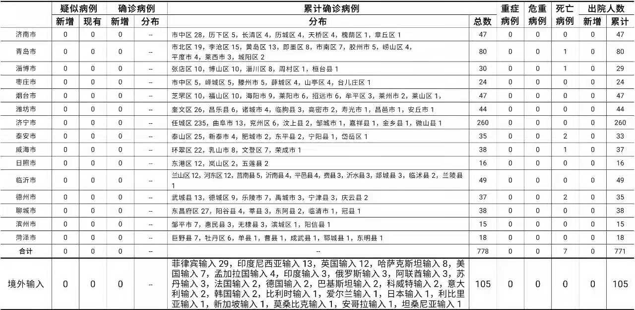 山东无新增本地疑似病例、确诊病例。累计报告确诊病例778例,死亡7例,治愈出院771例。山东无新增境外输入疑似病例、确诊病例。累计报告境外输入确诊病例105例,累计治愈出院105例。山东无新增无症状感染者。正在隔离观察治疗的无症状感染者4例(境外输入4例)。2020年以来全省共追踪到密切接触者30636人,目前尚有213人正在接受医学隔离观察。详见下表(单位:例):