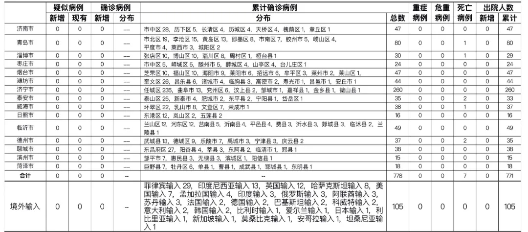 2021年7月20日0时至24时:山东无新增本地疑似病例、确诊病例。累计报告确诊病例778例,死亡7例,治愈出院771例。