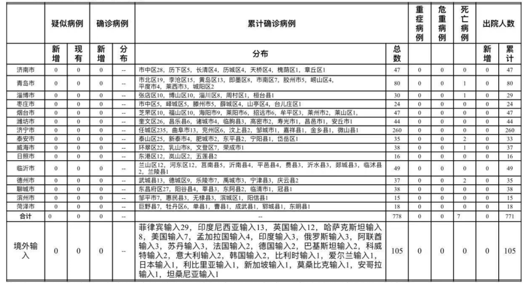 2021年7月22日0时至24时:山东无新增本地疑似病例、确诊病例。累计报告确诊病例778例,死亡7例,治愈出院771例。山东无新增境外输入疑似病例、确诊病例。累计报告境外输入确诊病例105例,累计治愈出院105例。青岛市报告境外输入无症状感染者1例。全省正在隔离观察治疗的无症状感染者5例(境外输入5例)。2020年以来全省共追踪到密切接触者30660人,目前尚有234人正在接受医学隔离观察。详见下表(单位:例):