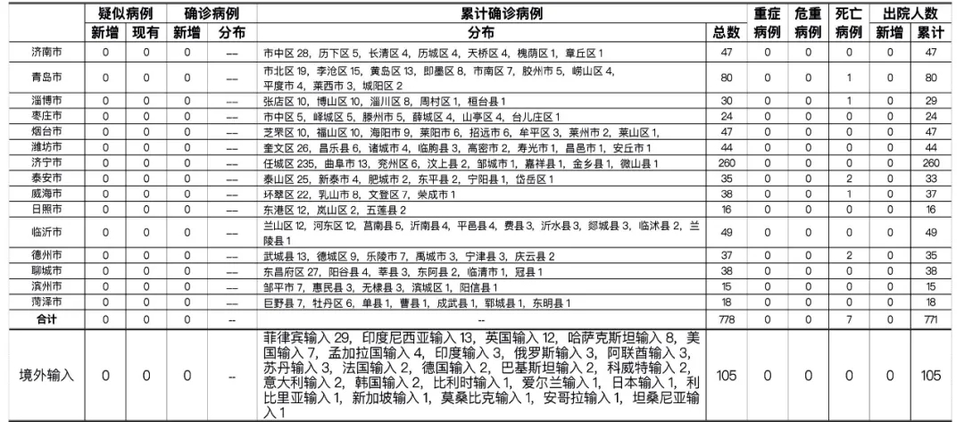 山东省本地病例按确诊时医院所在县区统计,境外输入病例单独统计。