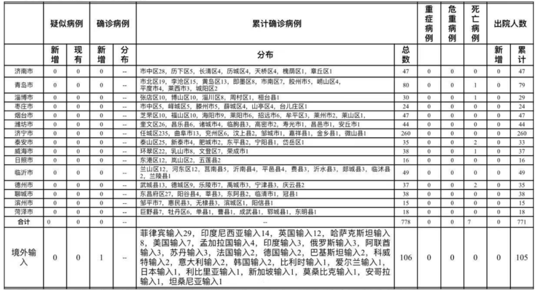 2021年7月27日0时至24时:山东无新增本地疑似病例、确诊病例。累计报告确诊病例778例,死亡7例,治愈出院771例。山东无新增境外输入疑似病例,青岛市报告印度尼西亚输入确诊病例1例。累计报告境外输入确诊病例106例,累计治愈出院105例。山东无新增无症状感染者。正在隔离观察治疗的无症状感染者7例(境外输入7例)。2020年以来全省共追踪到密切接触者31066人,目前尚有603人正在接受医学隔离观察。详见下表(单位:例):