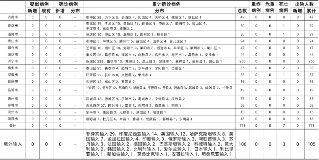 2021年7月28日0时至24时:山东无新增本地疑似病例、确诊病例。累计报告确诊病例778例,死亡7例,治愈出院771例。山东无新增境外输入疑似病例、确诊病例。累计报告境外输入确诊病例106例,累计治愈出院105例。正在住院治疗的确诊病例1例。山东无新增无症状感染者。正在隔离观察治疗的无症状感染者7例(境外输入7例)。2020年以来全省共追踪到密切接触者31135人,目前尚有672人正在接受医学隔离观察。详见下表(单位:例):