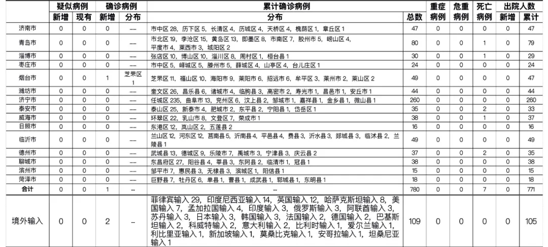 山东省本地病例按确诊时医院所在县区统计,境外输入病例单独统计。