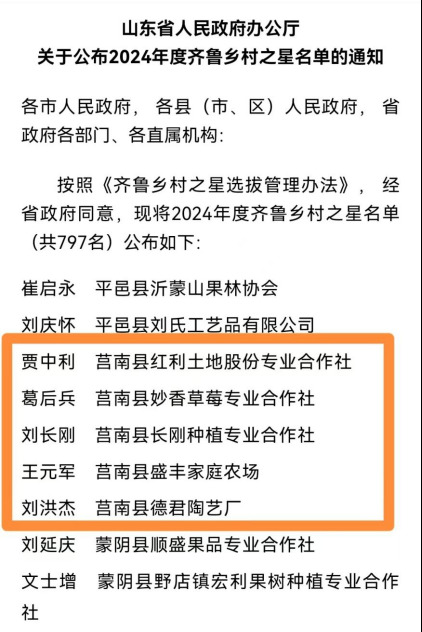 打印近日,省政府办公厅发布通知,公布2024年度齐鲁乡村之星名单,此次评选出的2024年度齐鲁乡村之星共有797名,我县5人入选。