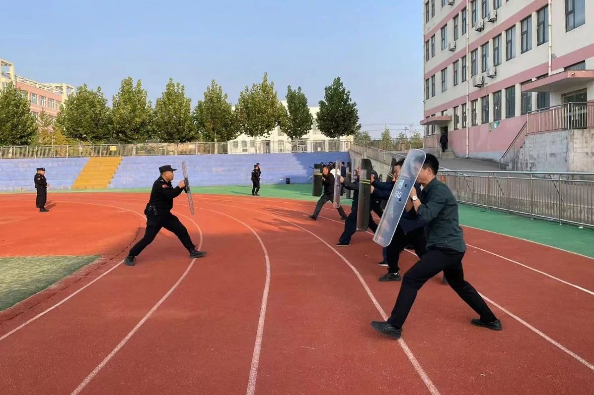 实训演练过程中,教官首先对校园防范基本常识做了理论授课,随后对盾牌、钢叉、长棍等防暴器械的使用做了培训。在受训人员熟练掌握后,针对人员、器械配合进行了重点培训,模拟不同的场景,检验最小应急单元人员反应速度,以及配合处置流程是否迅捷、规范。