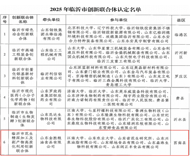 打印6月30日,临沂市科技局公布2025年临沂市创新联合体认定名单,由山东金胜粮油食品有限公司作为牵头单位申报的临沂市花生精深加工及副产物高质化利用创新联合体成功入选。