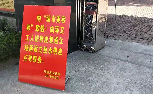 县文化和旅游局积极响应临沂市文化和旅游局《关于做好公共文化场所向环卫工人提供有关服务工作的通知》文件精神,助力莒南县迎接全省卫生城市复审工作,充分发挥文化场所的公共服务功能,组织开展了“为环卫工人送清凉”活动。在县文化馆大门口设置公示牌,热心为“城市美容师”们设立热水供应点,并为环卫工人开辟应急避让场所,以便环卫工人在遇到大风、大雨、高温、高寒等极端天气时,能够有地方避暑、避寒、避风、避雨。环卫工人对慰问人员表示深深的感谢,并表示将会继续为仁和的环境卫生贡献力量。(泉呈)