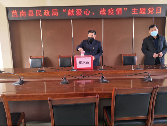 疫情无情人有情,主题党日献爱心。为充分发挥民政部门基层党组织战斗堡垒和党员先锋模范作用,坚决支持打赢新冠肺炎疫情阻击战莒南县民政局迅速响应上级部署和倡议,于3月6日开展了“献爱心,战疫情”爱心捐款活动。