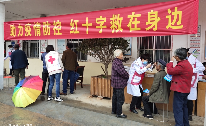 在前新庄村委院内,各医疗单位发挥自身特色优势,分别在眼保健、骨科、口腔保健、心理健康等方面为村里300余名群众进行免费查体、健康咨询、义诊义治,悉心为群众测量血压、检测骨密度、检查眼健康等。对符合救助条件的白内障患者,县红十字会将给予免费手术治疗。同时,围绕疫情防控、健康保健、应急救护、防灾避险等方面,县红会机关工作人员及红十字志愿队队员向群众宣传卫生安全和健康保健知识,引导公众正确认识和预防疾病,倡导健康生活方式,提高易受损群体自我防护意识和自我保护能力,为乡村振兴打下健康的身体基础。