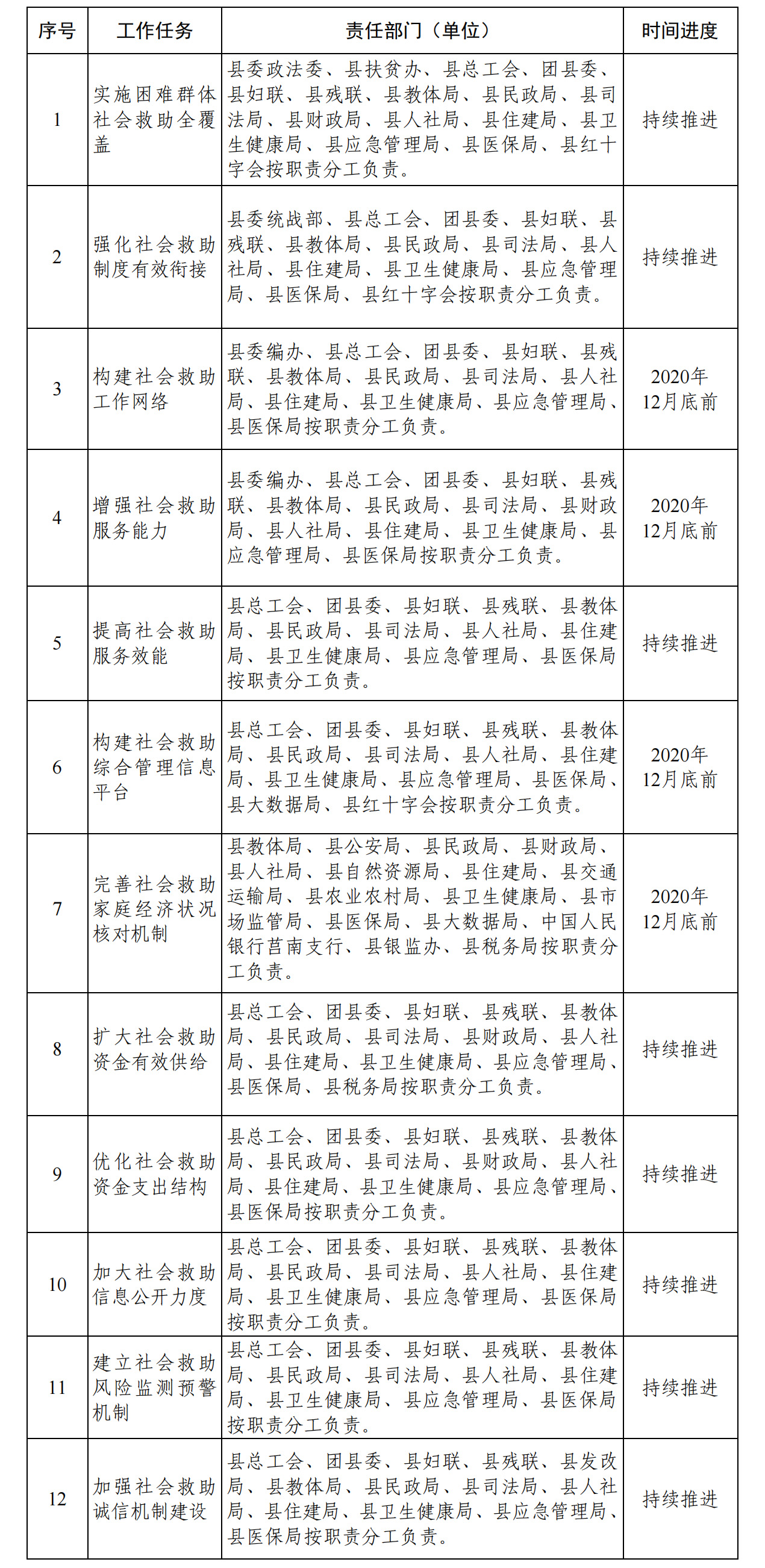 1.实施困难群体社会救助全覆盖。按照“全面整合、统筹实施”的原则,以低保、特困等基本生活救助为基础,教育、医疗、住房、就业、司法、康复等专项救助为支撑,受灾人员、生活无着的流浪乞讨人员、临时救助等急难救助为辅助,以慈善组织等社会力量参与为补充,建立健全分层分类的梯度救助制度体系。实现城乡最低生活保障人员、特困人员、建档立卡贫困人口和即时帮扶人口、受灾人员、生活无着的流浪乞讨人员、孤儿和困境儿童、唇腭裂和脑瘫儿童、重度精神病患者、困难残疾人、“两癌”贫困妇女、困难职工、需急救的身份不明和无力支付人员、因见义勇为致残人员及其家庭、见义勇为死亡(牺牲)人员家庭等困难群体全覆盖,切实编密织牢社会救助兜底保障网。